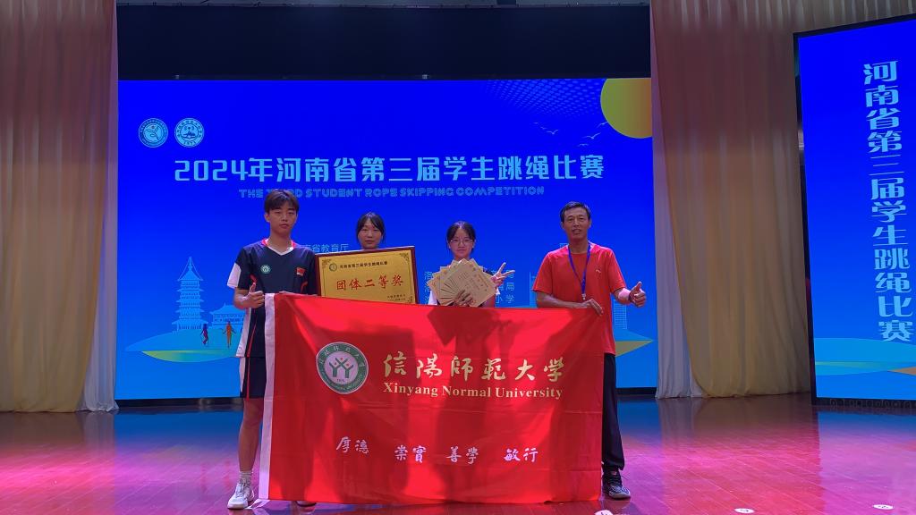 我校Ky开元集团张道启老师带领Ky开元集团体育教育专业22级学生杨子豪,社会体育指导与管理专业23级学生尚鹏宇,生命科学学院生物科学专业23级学生程玉莹三位同学参加了比赛并取得了可喜成绩。杨子豪获男子个人花样大学组第一名,杨子豪、尚鹏宇获两人车轮大学组第四名,程玉莹获女子大学组3分钟单摇第五名,杨子豪获男子大学组30秒单摇第五名,信阳师范大学获团体二等奖,张道启老师获优秀教练员荣誉称号。