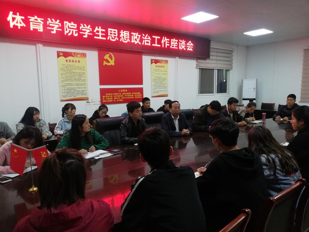 座谈会最后,陈青与大家诚恳谈心。他首先对大家关心学院发展、心系学生成长的情怀和付出表示感谢,他说:座谈会的目的就是找不足,促发展。他强调学生干部是开展学生工作的骨干力量,是学生日常思想政治教育和管理工作的基础。他对体育学生提出四点要求:一是要有坚定的理想信念。必须讲政治,高举旗帜,以习近平新时代中国特色社会主义思想为根本指引,深入学习贯彻党的十九大精神,要在学懂弄通做实上下功夫,强化“四个意识”,增强“四个自信”。二认识到当代大学生的历史使命 。当代大学生承担的是建设中国特色社会主义、实现中华民族伟大复兴的历史使命。 在新的起点上继往开来,当代大学生,是我国社会主义事业的建设者和接班人,要继承前辈开创的伟大事业,推进中国特色社会主义的航船继续破浪前进。 当代大学生成长成才和创业的时期,正是国家发展的重要战略机遇期,时代为同学们提供施展才华的大好机遇和广阔空间。三是要主动担当。青年一代有理想、有本领、有“担当”,国家就有前途,民族就有希望。大学生是历史使命的继承者,是社会主义事业的合格建设者和可靠接班人,肩负着承接我国未来社会主义事业的建设工作的重任,是未来社会的中坚力量,只有大学生担当起社会建设的职责,才能践行社会主义核心价值观、实现中国梦。四新时代的大学生,要把个人的“小我”融入国家和集体的“大我”之中。在维护和实现国家与人民利益的过程创造个人的辉煌人生。 知行统一、脚踏实地。当代大学生要努力将书本知识和实际行动密切联系起来,塑造“知行统一、脚踏实地”的良好形象。