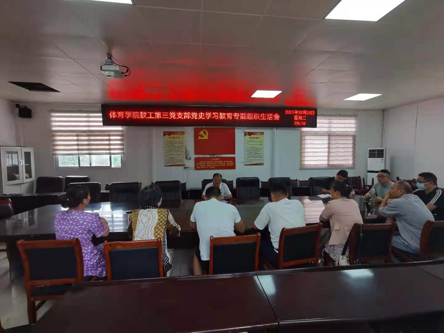 2021年8月24日上午,按照信阳师范学院委党学习教育领导小组办公室关于召开党史学习教育专题组织生活会的通知要求,Ky开元集团教工第三党支部在Ky开元集团三楼会议室召开党史学习教育专题组织生活会,会议由党支部书记王德华主持。本次组织生活会紧紧围绕“学党史、悟思想、办实事、开新局”主题,认真学习了习近平总书记在党史学习教育动员大会上的重要讲话和中央指定的4本学习材料,重点学习了总书记在建党一百周年庆典上的重要讲话。组织生活会前期,支部委员、党员等之间进行交心谈心,对照四个方面进行检视分析,与会党员同志们纷纷发言,交流学习心得,查找存在的问题,时刻剖析问题产生的原因,深挖症结根源,明确整改方向。并紧密结合现代社会发展实际以及如何在“十四五”开局为有效促进我校体育教学改革高质量发展提出有针对性的意见和建议。