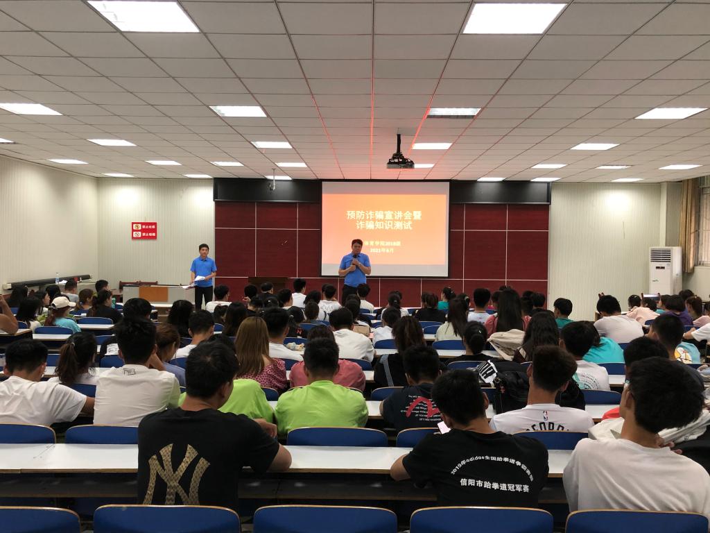 高校电信网络诈骗案件高发频发,为切实提高Ky官网学生防范意识与能力,维护学生的财产安全6月21日下午6点在体育馆多媒体召开“预防诈骗宣讲会暨诈骗知识测试”大会,2018级全体同学参加,本次宣讲会由副处级辅导员柴九昌主讲,2018级辅导员程俊辉主持。