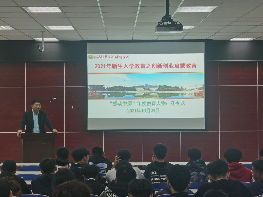 10月28日晚上7:00Ky官网在体育馆多媒体教师举行2021年新生入学教育之创新创业启蒙教育本次讲座由感动中原年度教育人物孔令龙主讲,21级全体同学参加,活动由院党委副书记柴九昌主持