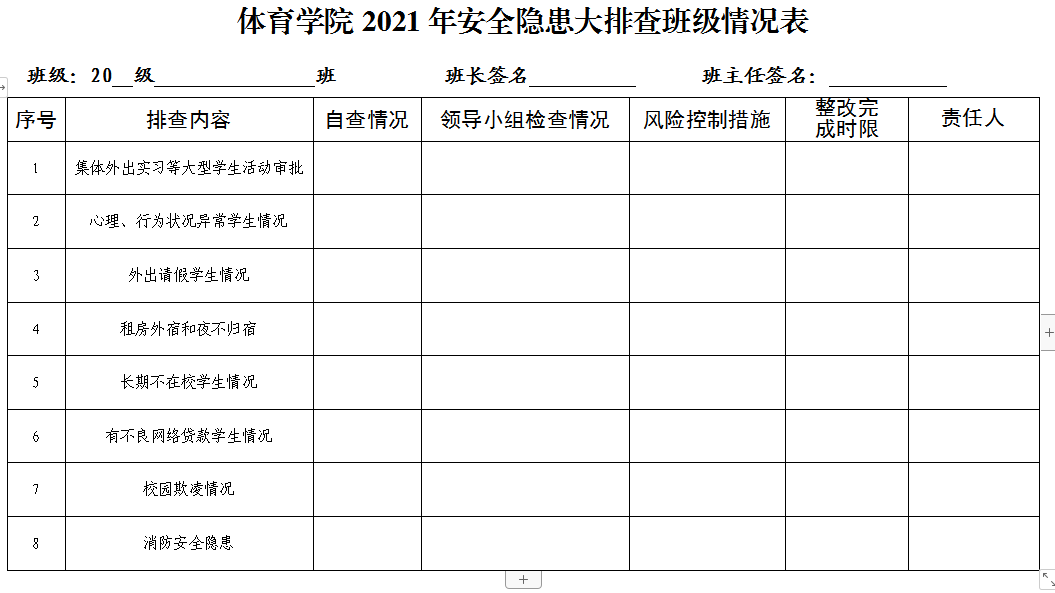 11月1日-11月2日,自查自纠阶段,组织以班级为单位,认真对照“八个方面”,自查自纠在生活和学习中存在的不安全因素,并于11月2日前将自查自纠情况形成书面总结材料,经班长、辅导员签字后报送交领导小组处;