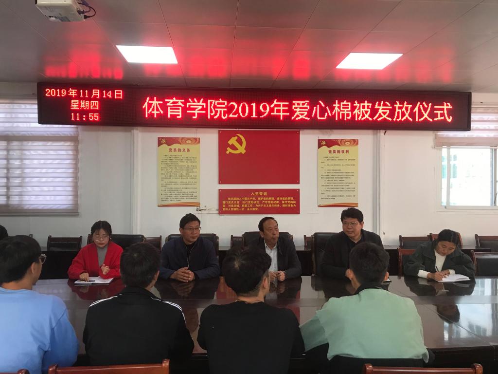 2019年11月14日Ky开元集团在三楼会议室开展“寒冬送温暖”棉被发放仪式。党委书记陈青、副院长牛林杰、副处级辅导员柴九昌、辅导员赵倩倩、赖梦玥出席棉被发放仪式。棉被发放仪式上,首先由柴九昌老师讲明发放棉被的目的、受助同学的评选标准。接着,柴老师对同学们进行感恩教育,一床棉被很小,但是这床棉被了灌注了学校、学院对同学们的关心与爱护。不仅如此,这床棉被还教会同学们做个学会感恩、懂得感恩的人,并希望同学们以后能在社会中将这份爱传递下去。随后,党委书记陈青发表讲话。陈书记指出,学校历来重视家庭经济困难学生资助工作,学院领导和老师都非常关心家庭经济困难学生的学习和生活。学校会尽最大努力解决生活困难学生的实际问题。最后,陈书记对同学们提出希望,在困境中要拥有乐观的心态,面对困境要有自强不息的精神,立志成才,努力奋斗。