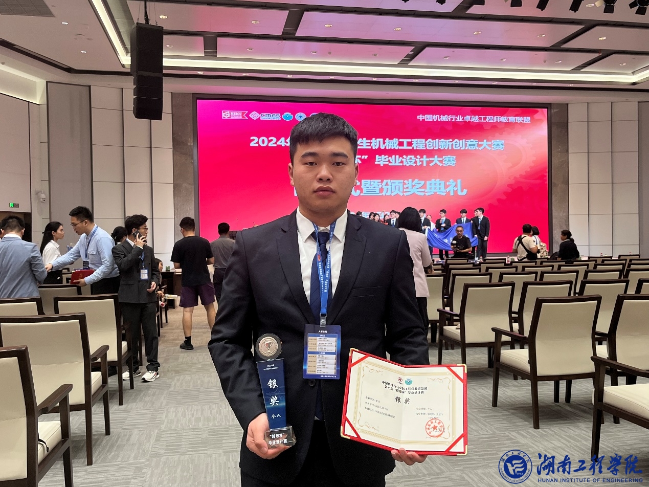 6月2日,2024年中国大学生机械工程创新创意大赛“精雕杯”毕业设计大赛决赛在浙江大学举行。由beat365官网机械工程学院邹鸿翔博士团队指导,机械设计制造及其自动化专业2020级李享同学完成的“车辆滚压能量收集装置”取得新突破,以决赛分组小组第一名出线,并在“金奖角逐答辩”中斩获银奖,同时获得一等奖。