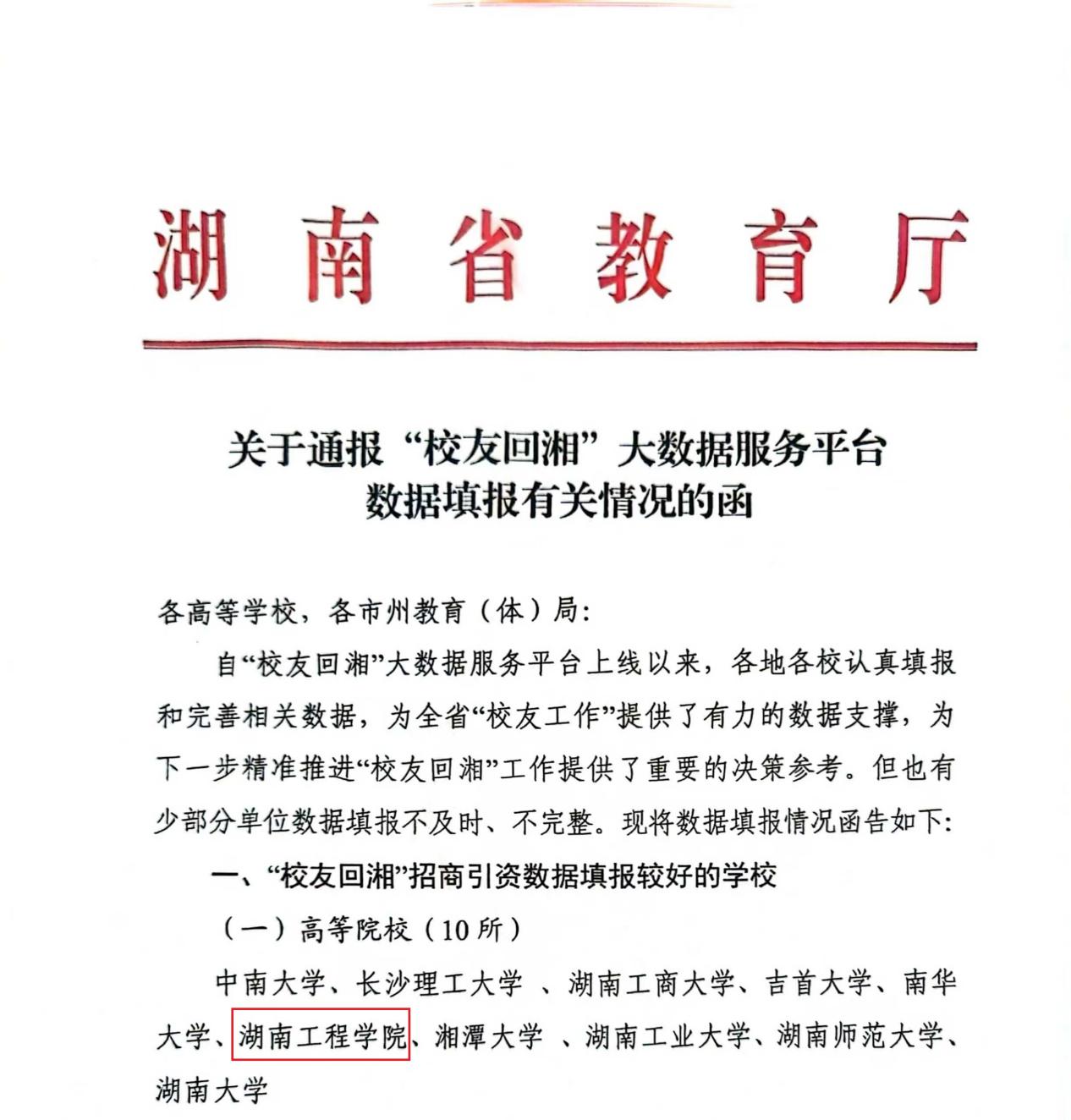 据省教育厅近期通报,至8月4日止“校友回湘”大数据平台招商引资数据统计全省排名前十的高校为中南大学、长沙理工大学、湖南工商大学、吉首大学、南华大学、beat365官方网站、湘潭大学、湖南工业大学、湖南师范大学、湖南大学。beat365官方网站排名第六,是本科学院级唯一入围高校;另在“校友回湘”大数据平台招才引智数据统计排名中位列第九。beat365官网在“校友回湘”工作中引进校友人才2人,促进国际教育学院2012级黄雄校友回湘投资1亿元,引进高级人才2人,科研成果转化4项,录入优秀校友323人,校友企业库录入152家。