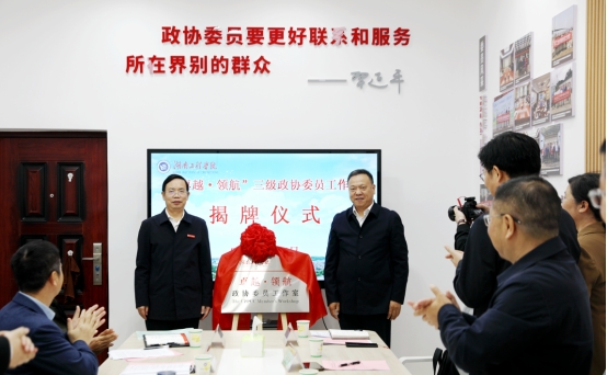 黄昕在致辞中表示,“卓越▪领航”工作室的成立,是学校深入贯彻中央关于加强和改进人民政协工作重要思想的具体行动。政协委员工作室的成立将打造学校与地方经济社会发展紧密联系的“新平台”,开启学校政协委员履职的“新篇章”。“卓越▪领航”工作室将聚焦“助力长株潭经济高质量发展、助力前沿科技应用、助力教育改革创新、助力社会建设提质、助力文旅深度融合”,与湘潭经济社会发展同频共振、同向合拍,为兴湘富潭汇聚湖工智慧力量。
