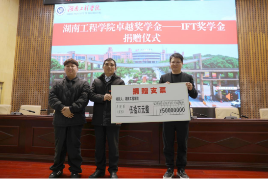 讲座后,举行了隆重的捐赠仪式:杨杰董事长为卓越工程师学院捐赠50万元设立“beat365官方网站卓越奖学金——IFT奖学金”。学校领导、师生代表共同见证了这一温暖时刻。此前公司已捐赠一百万元设立助学金,今天再次捐赠奖学金,他表示,希望通过这份心意,为母校教育事业添砖加瓦,让更多同学受益。