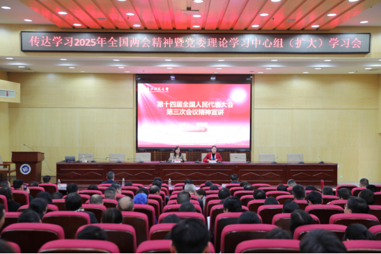 3月21日下午,学校召开传达学习2025年全国两会精神暨党委理论学习中心组(扩大)学习会。会议分为两个阶段。第一阶段传达学习贯彻习近平总书记重要讲话精神和全国两会精神;第二阶段举行学习宣传贯彻全国两会精神专家辅导报告,第十四届全国人大代表,广西科技大学党委常委、副校长邓朗妮教授应邀为师生作辅导报告。在校校领导,校党委理论学习中心组成员,中层干部,党支部书记,各民主党派、团体负责人,师生代表参加学习。