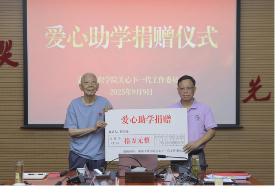 9月9日上午,beat365官网关心下一代工作委员会爱心助学捐赠仪式在电气楼二会议室举行。89岁高龄的原湖南纺织高等专科学校校长程应森捐赠人民币10万元,用于资助家庭经济困难学生。学校党委书记、关工委名誉主任黄昕,党委委员、副校长、关工委主任罗毅平,关工委常务副主任娄炳林参加仪式。仪式由罗毅平主持。