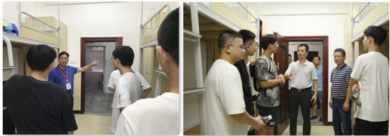 暖心的问候,悉心的叮嘱,当天下午和晚上,校领导还前往宿舍区,看望来自五湖四海的新生,了解学生基本情况。“宿舍里干净整洁,崭新的家具让人惊喜。”“很兴奋,没想到住宿条件这么好,还是‘江景房’。”“拍了照片发给爸爸妈妈,他们都很放心。”住在滨江宿舍区的同学们你一言我一语地向前来看望他们的校领导表达对湖工的“初印象”。校领导与初来乍到的孩子们亲切交谈,勉励大家尽快适应大学新生活,“你们的‘喜欢’就是对学校迎新工作的最大肯定,希望你们珍惜大学四年好时光,努力学习,增长才干!”