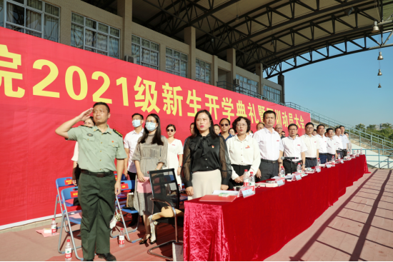 新生开学典礼后举行2021级本部新生军训动员大会。党委书记陈岳堂为军训团授旗。