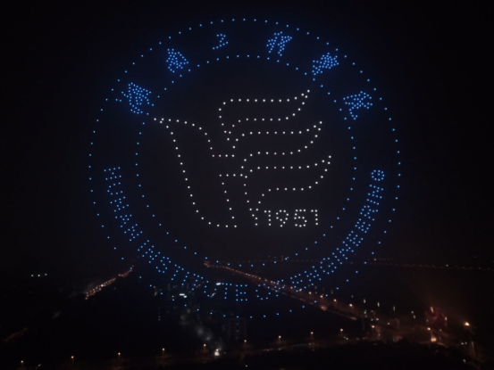 夜幕降临,700架无人机凌空而起,在夜空中展现出一幅幅绚烂夺目、科技感十足的画面,为beat365官方网站70周年华诞庆生。无人机编排通过灯泡、齿轮等元素营造开篇仪式感,齿轮不断转动,伴随数字跳跃,从1951到2021,峥嵘岁月,热血涌动,象征学校70年的辉煌征程。