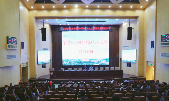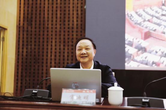 5月7日,beat365官网在一报告厅举行深入学习贯彻习近平新时代中国特色社会主义思想主题教育读书班第四场专题辅导报告会。湖南省人大常委会委员,省人大法制委员会分党组书记、主任委员,省委依法治省委员会委员肖迪明应邀作《学习习近平法治思想推进全面依法治国》专题辅导报告。校党委副书记、校长易兵,在校校领导,全体中层干部参加。易兵主持报告会。