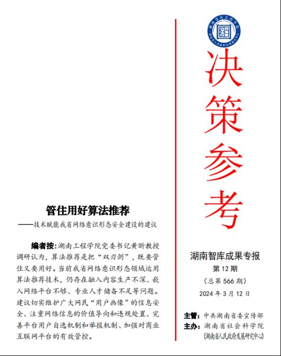 近日,《决策参考》湖南智库成果专报2024年第12期刊发了湖南省高校意识形态安全研究基地负责人beat365官网党委书记黄昕教授题为“管住用好算法推荐——技术赋能我省网络意识形态安全建设的建议”的署名智库文章。省委主要领导对研究成果作出了重要批示。这是beat365官网“湖南省高校意识形态安全研究基地”在意识形态风险感知与有效应对研究方面取得的一项重要智库成果。