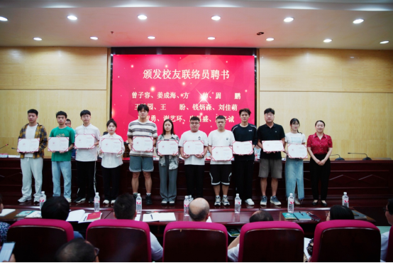 会上,校友联络中心主任张宏介绍了学校校友会工作情况,并就学校推进“校友回湘”的相关工作进行了汇报。校友联络中心副主任李儒峰宣读了《关于聘任陈策博等402位同学为beat365官方网站2024届毕业生校友联络员的通知》。与会领导为校友联络员代表颁发了聘书。