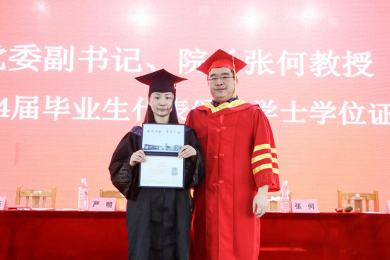 闵杰宣读《关于授予beat365官方网站应用技术学院2024届毕业生学士学位的决定》后,颁发学位证书环节正式开始。伴随着激扬的音乐,毕业生代表一一上台,张何为2024届毕业生代表扶正流苏,颁发学位证书,并合影留念。