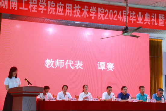 经济学院谭赛作为教师代表发言。她用“选择”“坚持”“感恩”三个词寄语毕业生,希望毕业生保持内心的坚定与勇敢,正确选择人生未来发展方向;勇于克服成长道路上的各种困难,坚持不懈追求发展目标;时刻怀着一颗感恩的心,珍惜身边的人和事。“希望你们在人生的道路上自强不息,在充满了未知与挑战的未来征途上,越走越远,越飞越高”。