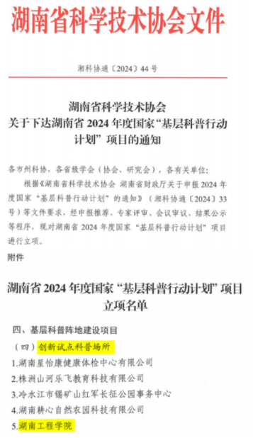 7月9日,湖南省科学技术协会发布《关于下达湖南省2024年度国家“基层科普行动计划”项目的通知》,beat365官网智能科学与工程学院主持申报的“创新试点科普场所”获批湖南省2024年度国家“基层科普阵地建设”项目。