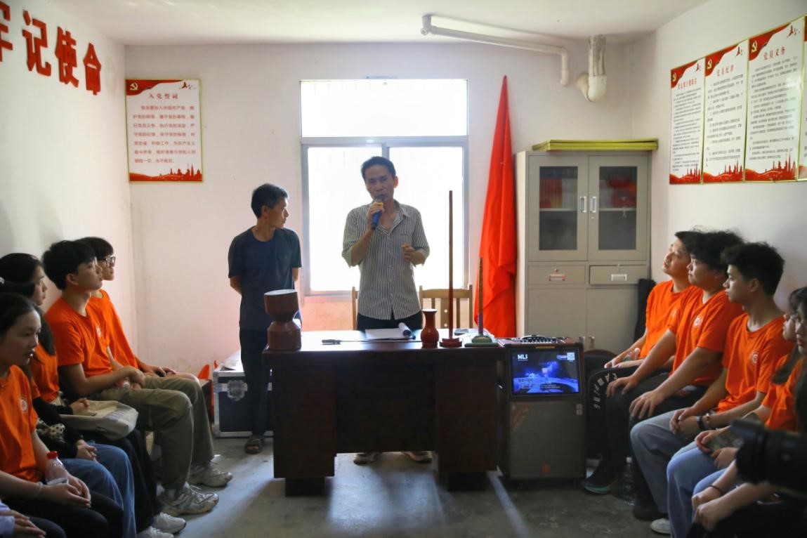 灰汤杂技传承人肖学东从历史渊源、基本内容、主要特征、重要价值、存续状况等五个方面详细介绍了灰汤杂技。并与师兄一同为实践团表演了口吐金龙、顶技、平衡术、称杆提米、花样转碟、眼皮提物等精彩的杂技。现场掌声不断、喝彩不断。随后,肖学东邀请宣讲团成员们亲身体验“转碟”表演,在他指导下,大家纷纷将手中数支碟片在空中转起,共同体验了一堂生动的非遗杂技课程。