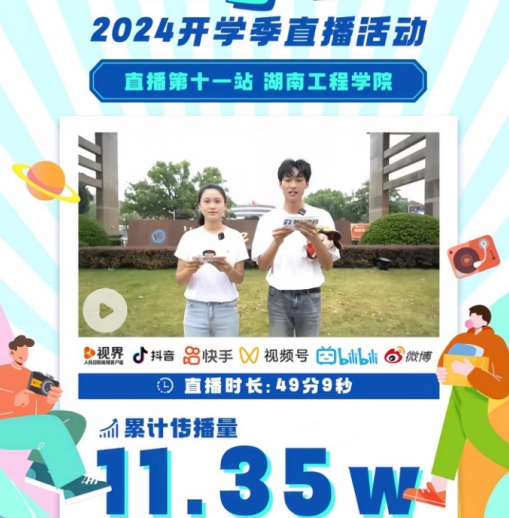 整场直播持续近一个小时,是校团委为2024级新生准备的系列活动之一,也是学校落实“我为同学做实事”的创新举措。通过同学们喜闻乐见的方式,传递出湖工学子朝气蓬勃、青春昂扬的精神风貌,向社会各界充分展示学校独特魅力和深厚文化底蕴。
