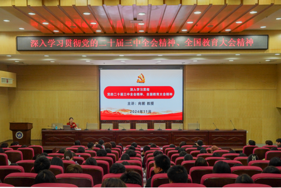 为深入学习贯彻党的二十届三中全会精神及全国教育大会精神,11月13日,校党委副书记向前在二报告厅以《深入学习贯彻党的二十届三中全会精神、全国教育大会精神》为题讲授思政课,管理学院、经济学院、计算科学与电子学院两百多名学生参加学习。