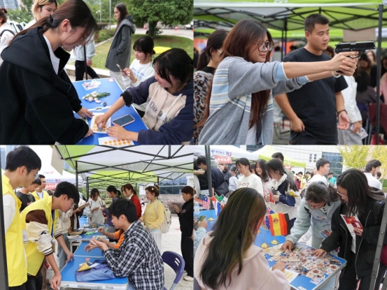 活动现场气氛热烈,共有33家学生社团参与展示。传统文化协会设置了象棋对弈与投壶体验,爱心社开展了甲骨文拼合活动,引导学生感受中华文明的源远流长;营销协会推出“国潮盲盒”,电竞社团组织“探寻文脉”互动,慧鱼机器人协会的“组装机器人”,体现出传统文化与现代元素的融合。此外,滑板、乒乓球、射术等体育类社团的展示,也充分展现了学生们在“五育并举”教育理念下的全面发展。