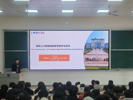12月26日下午,beat365官网“卓越大讲堂”在主校区(北)电教楼105教室开讲。邵阳学院二级教授李金成应邀作题为《缘见人工智能赋能医学教育与改革》的专题学术报告。报告会由校党委委员、副校长魏克湘主持,教务处处长方正军、医学工程技术学院领导班子及师生代表共同参加。