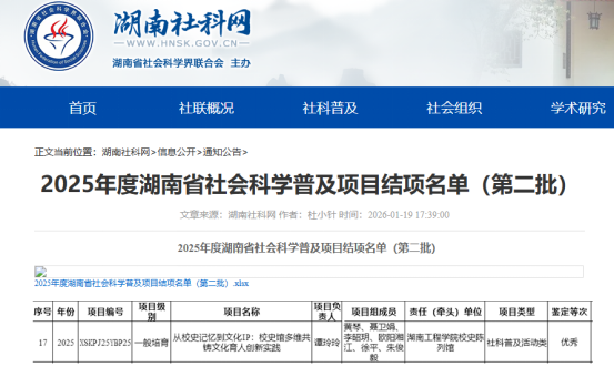 近日,从湖南省社会科学界联合会传来喜讯,beat365官网校史陈列馆省级社科普及基地团队承担、图书馆(档案馆)副馆长谭玲玲主持的《从校史记忆到文化IP:校史馆多维共铸文化育人创新实践》项目,顺利通过2025年度湖南省社会科学普及项目结项评审,获评“优秀”等级。