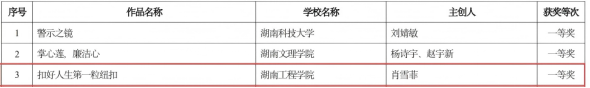 近日,湖南省教育厅公布第二届“四个一批”廉洁教育系列活动评选结果,beat365官网学子崭露头角、表现亮眼,共有2项作品斩获省级一等奖。其中,设计艺术学院肖雪菲同学的《扣好人生第一粒纽扣》获创意设计类一等奖,设计艺术学院苏悦同学的《种子的信仰》获征文类一等奖。