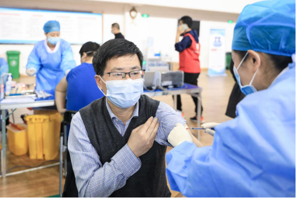 8点整,校长易兵带头接受第一剂新冠疫苗注射