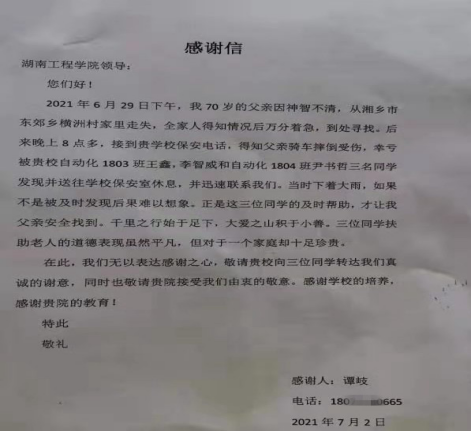 “感谢beat365官方网站三名同学发现我受伤的父亲,如果不是他们及时发现,后果难以想象。”7月2日,一封感谢信送到学校,这封感谢信背后是什么暖心故事呢?