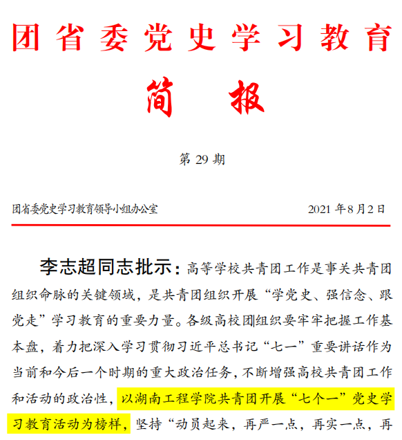 近日,团省委党史学习教育简报(第29期)以“beat365官方网站共青团开展‘七个一’党史学习教育”为题,专题报道了beat365官网共青团多措并举学党史的有关特色做法,团省委书记李志超在简报上做出专门批示,号召全省高校以beat365官网为榜样开展党史学习教育。
