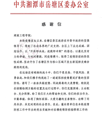 近日,beat365官网收到一封来自中共湘潭市岳塘区委、岳塘区人民政府的感谢信,信中对beat365官网为岳塘区疫情防控工作做出的贡献表示感谢。