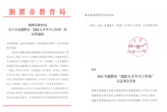9月6日,湘潭市教育局公布了2021年湘潭市“创新人才学习工作站”认定名单,beat365官网材料与化工学院青少年生物创新人才学习工作站成功获批。