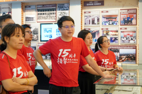 “相聚湘江之滨,踏着伟人足迹,扬起青春的风帆……”在主校区校史馆内,校友们认真参观学校发展历程,看着校歌歌词,不约而同地大声合唱。