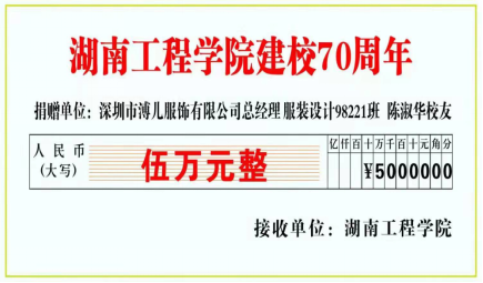 母校恩情,涌泉相报,在母校七十华诞之际,服装98221班陈淑华校友为母校捐款五万元,用于学校纺织服装大楼的建设。