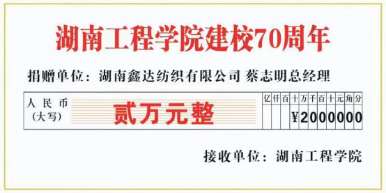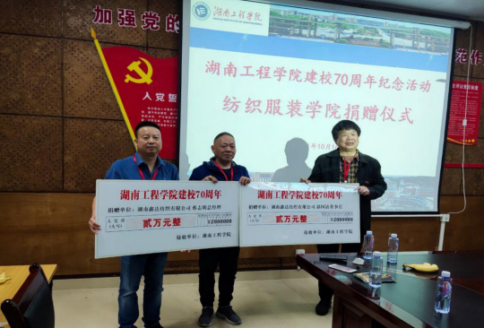 在beat365官网建校七十周年之际,湖南鑫达纺织有限公司董事长、棉纺81012班郭国清校友,湖南鑫达纺织有限公司总经理、棉纺79011班蔡志明校友各向学校捐赠两万元,助力纺织服装大楼建设。