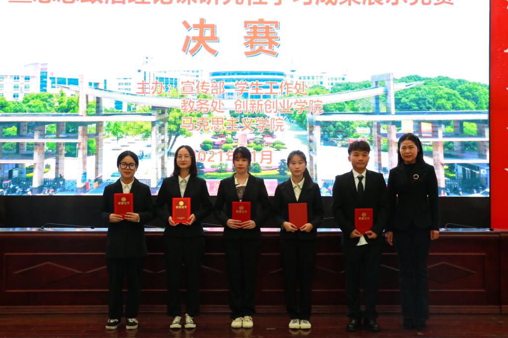 决赛中,前10名参赛小组按照抽签顺序,以生动的语言和精心准备的PPT,从“选题的原因”“研究综述”“研究性成果”“下一步研究计划”和“研究性学习体会”五个方面展示了精彩的研究成果,彰显了团队合作的力量。经过激烈角逐,最终,研究性成果《传承伟大建党精神为民族复兴贡献青春力量》(国贸1901、1902班易天赐、周盼、胡琳、王思、叶琴,指导老师邓学源、汤菊平)获得特等奖,《乡村振兴与大学生就业发展研究》(广告学1901班史青青、李婉婷、李琪、赵勇、秦晓,指导老师闵雪)、《乡村振兴战略中公路建设的作用》(土木工程1903刘宇熙、任泉、王义舜、杨达、何正生,指导老师胡高飞)、《青年斗争精神研究》(会计学2084班胡丽飞、陈茴兰、刘和佩、欧阳睿子、刘定宇,指导老师赵洁)等3组成果获得一等奖,其余6组成果获得二等奖。