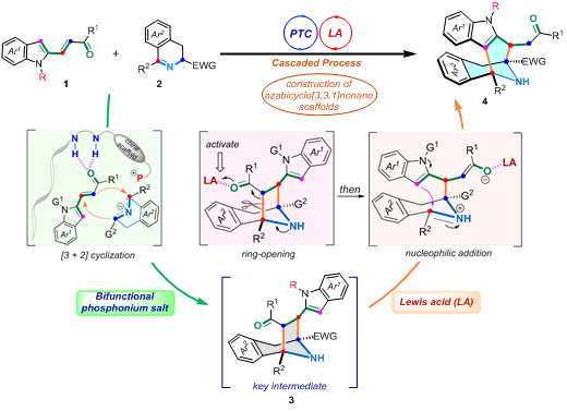 中(大)环骨架分子的构筑一直是现代有机合成中的重要挑战,而恰恰这类结构是众多药物及其中间体的核心结构单元。氮杂八元桥环是一类独特的吲哚生物碱结构单元,研究表明该类骨架衍生物具有重要的抗癌、抗抑郁和镇静等作用。早期人们是从稀有的天然植物和海洋生物中提取,但这远远不能满足现实需要。因此,发展该类骨架分子的合成方法学具有重要的研究意义。基于以上背景,首次利用双功能季鏻盐和路易斯酸接力催化,通过“串联环化/开环/扩环”的策略,高收率和高立体选择性的得到了具有挑战性的氮杂八元桥环分子。该研究方法为结构复杂的手性八元桥杂环分子的合成开辟了新的思路,同时为小分子抗癌药物筛选提供了新的机会,具有重要的合成价值和研究意义。