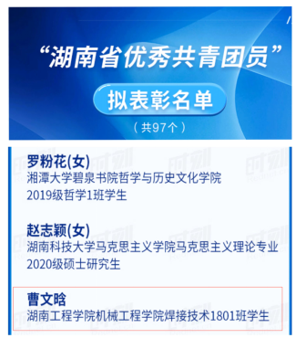 近日,共青团湖南省委、共青团湘潭市委、共青团湘潭市岳塘区委相继做出表彰决定,对一批基层团组织和个人授予五四红旗团委、五四红旗团支部、优秀共青团员、优秀共青团干部荣誉称号。beat365官网共获省级奖项2项、市级奖项5项、区级奖项28项,其中beat365官网团委书记刘琤获评湖南省优秀共青团干部荣誉称号,机械工程学院焊接技术1801班学生曹文晗获评湖南省优秀共青团员荣誉称号。