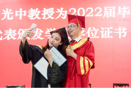 闵杰宣读《关于授予2022届毕业生学士学位的决定》,李光中为毕业生代表正冠,拨穗,授予学位证书。扶正流苏,比心拥抱,留影赠别,仪式现场庄重又温馨。四年辛勤付出终获回报,赤诚热血的初心照亮一名名刚直坚毅的毕业生。