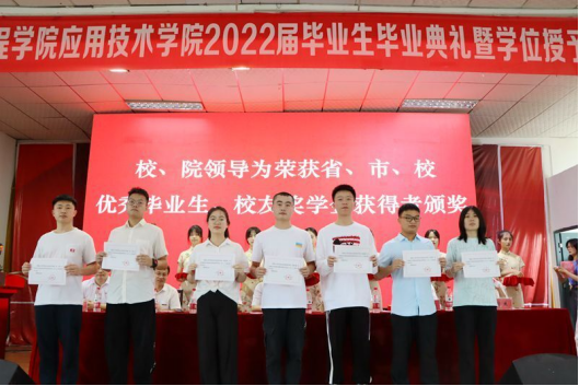 四年拼搏,终有所获。黎娅宣读《关于表彰2022届省、市、校优秀毕业生的决定》,34人被授予省级优秀毕业生,29人被授予市级优秀毕业生,92人被授予校级优秀毕业生。陶连洲宣读《关于表彰beat365官方网站应用技术学院校友奖学金获得者的决定》,26人获校友奖学金。现场领导为优秀毕业生和校友奖学金获得者颁发荣誉证书。