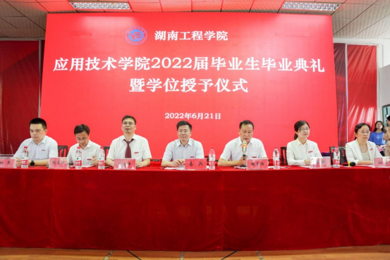 夏至时节,万物并秀,骊歌唱响六月时,青春启航逐未来。6月21日下午,应用技术学院毕业典礼暨学位授予仪式在南校区一教四楼学生活动中心举行,祝贺2022届毕业生顺利完成学业,开启人生新征程。校党委副书记、校长易兵,党委委员、副校长魏克湘,应用技术学院院长李光中,党委书记黎娅,党委副书记陶连洲,副院长闵杰、刘杰,全体辅导员、班主任共同到场见证2022届应院学子成长蜕变的重要时刻。典礼由魏克湘主持。
