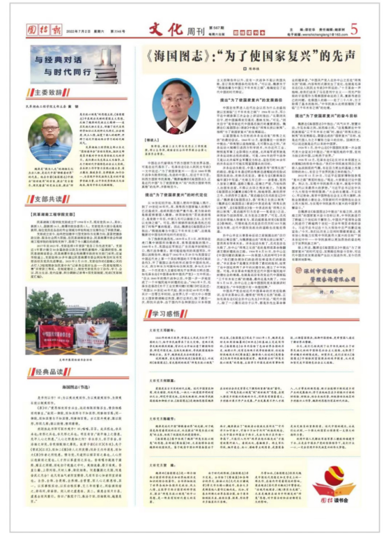 以此次约稿为契机,在《团结报》的策划下,在民革湖南省委会、民革湘潭市委会指导下,在beat365官网党委统战部和工会的大力支持下,支部选定“敢为人先”的湖湘文化杰出人物、清代著名的启蒙思想家、政治家和文学家魏源——《海国图志》一书作为活动的主题书籍。读书会活动以湘潭市政协委员、支部党员、材料与化工学院副院长陈建芳为领读人,校工会副主席朱洁作为组织和宣传人。《团结报》报道了读书会开展的情况,并刊登了支部主委黄韧的致辞,以及支部党员陈建芳、邓新年、贺维、何丽嘉的学习感悟。黄韧希望各党员通过对中华优秀文化作品的赏读,立足本职,以德修身,务实自律,在文化传承中谋发展,在继往开来中续新篇,为实现中华民族伟大复兴中国梦贡献力量,以实际行动迎接党的二十大胜利召开。