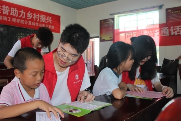 “两鬓霜一客行,新绿衬酒红,七颗星一袍风,尧舜对苍生……”,电气与信息工程学院实践团来到湖南省宁乡市大成桥镇通过传唱歌曲、诵读经典诗词、发放普通话推广宣传手册等方式,教当地留守儿童讲普通话,弘扬中华民族优秀传统文化。“传承文脉需要大众传播的载体,而普通话是最广为流传的语言媒介。”实践团成员陈妮娜说道。