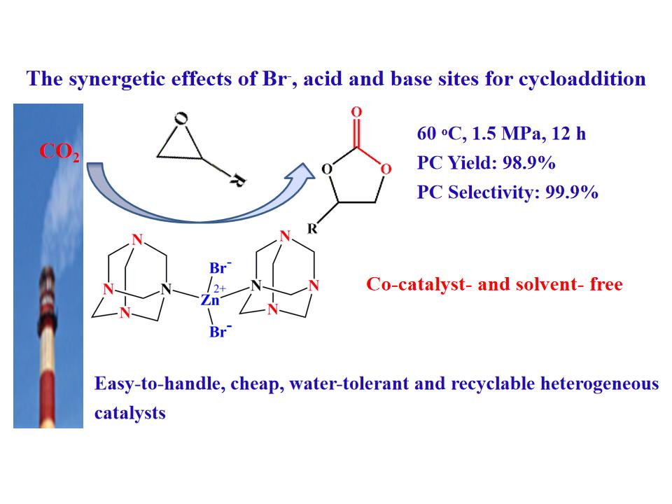 CO2资源化属于国际前沿研究课题。以工业废气中的CO2为C1资源与环氧化物环加成反应合成环状碳酸酯,不仅可避免CO2捕集与封存过程中能耗高和潜在风险大等问题,还具有原子利用率高、副产物少等优点,符合绿色化学和可持续发展的理念要求,是实现“碳中和”的完美方案之一,该工艺的核心是开发高效稳定的多相催化剂,精确构建协同催化中心并调控其结构是关键。