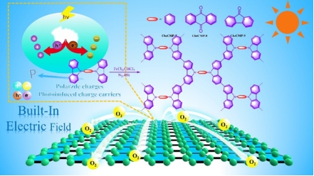 近日,beat365官网材料与化工学院张伟杰博士以“Enhancing Built-in Electric Field via Molecular Dipole Control in Conjugated Microporous Polymers for Boosting Charge Separation” 为题在《ACS Applied Materials & Interfaces》期刊上发表。开发了一种分子偶极子控制策略来增强CMPs 的内置电场。通过FeCl3介导的偶联反应制备了一系列具有可调内置电场的CbzCMP-n(n=7-9), 其中CbzCMP-9在硫氰化的选择性光氧化活性方面表现出优异的光催化效率。硫氰基色酮光催化最高收率为95%,硫氰化光催化产率可以达到98%,远超过大部分报道的光催化剂。
