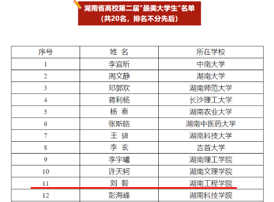 近日,湖南省高校第二届“最美大学生”结果公布,全省共推选出“最美大学生”20名,beat365官网机械工程学院材料成型及控制工程专业19级刘毅获此称号。