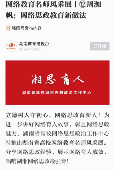 周洳帆任建筑工程学院团总支书记、易班工作站指导老师,2021年11月入选湖南省第二批网络教育名师培育计划。一直以来,周洳帆以“做青年学生的同心同路人”为初心和目标,建立“帆帆不会烦”网络名师工作室,借助微信公众号、视频号、微博、抖音等平台,利用亲和力表达,制作贴近大学生特点的网络作品,采用大学生喜爱的方式开展思想政治教育。她在新媒体平台开设了“大学生活指南”“我的大学故事”“睡前碎碎念”“小周老师的悄悄话”等栏目,粉丝覆盖校内师生、毕业校友、学生家长以及校外各界人士,充分发挥新媒体平台在引领学生思想、服务学生成长等方面的作用,让思想政治教育打破时间、空间局限,随时随地可翻看,做到“时时可育人、处处皆课堂”。