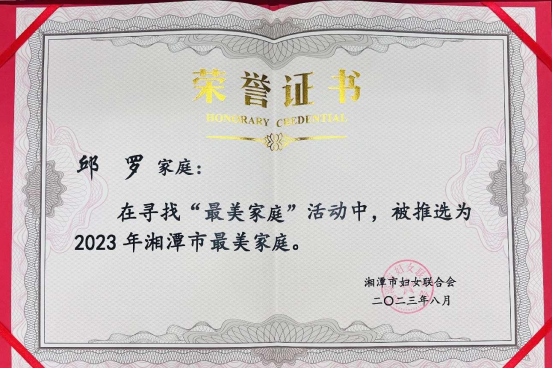 10月20日,市妇联联合市文明办举办的湘潭市“情暖重阳话家风”家庭文明建设暨“湘潭市最美家庭”“湖南省文明家庭”颁奖活动在市总工会举行。活动现场揭晓了30户在孝亲、书香、清廉、绿色等方面有突出事迹的最美家庭。beat365官网教师邱罗家庭荣获2023年湘潭市“最美家庭”荣誉称号。